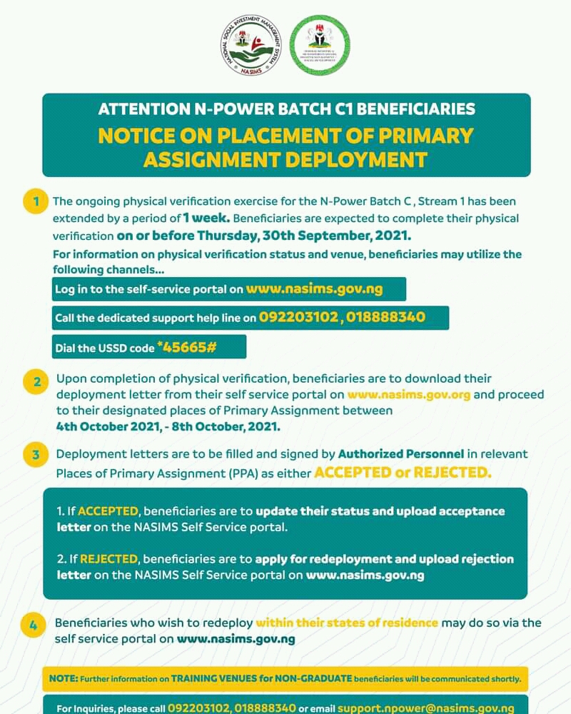 The Ministry in the Statement, Friday, also encourage the Batch C Stream 1 N-power Beneficiaries to download, sign their deployment Letters in their Places of Primary Assignment and upload the duly signed Deployment Letters between October 4th to 8th October, 2021.